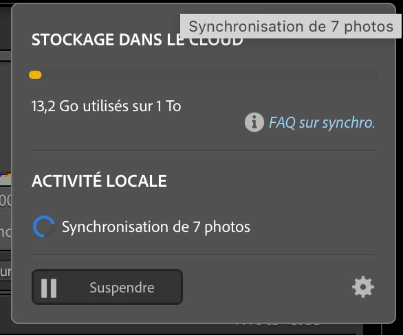 LrC m'indique que la synchronisation de 7 photos est en cours.