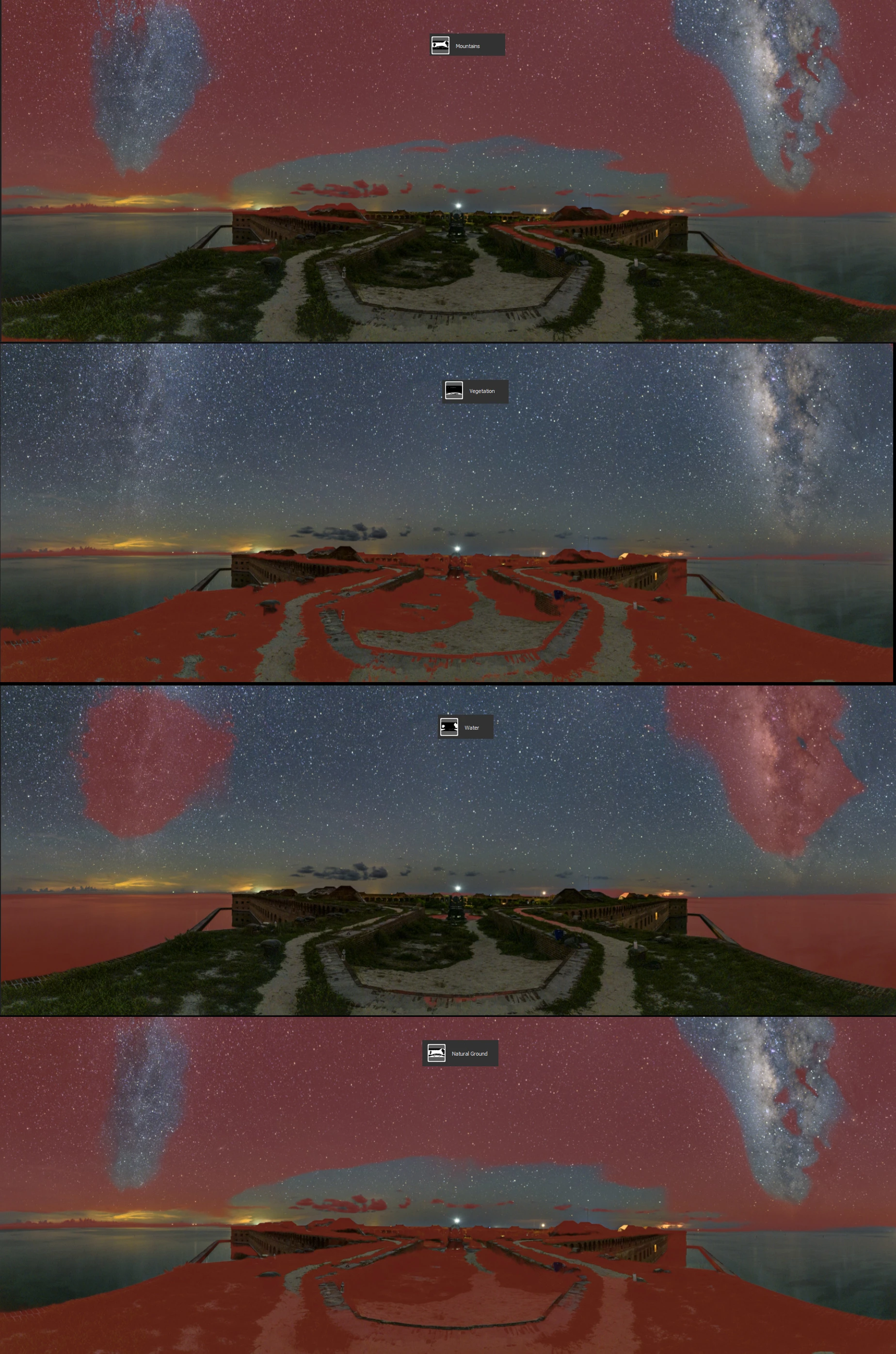 However, there is one major shortfall or bug: it often creates overlapping masks, re-using the same portions of the photo for multiple unrelated masks. I can see how "mountains" and "vegetation" overlap and be used in both masks, but "water" should not be re-used for "sky" or "mountains" or "ground". Water is water, it is neither of the others. I attached an example where it not only fails to detect the sky (it detects it as Mountains - but excludes the Milky Way) and then uses that same sky portion in the "natural ground" mask. The "water" mask includes the Milky Way in the sky, even though there is a fairly clear horizon line. The latter is clearly a failure of A.I., but in general, masks should not overlap and should programmatically be exclusive of each other (perhaps with the exception of mountains and vegetation).