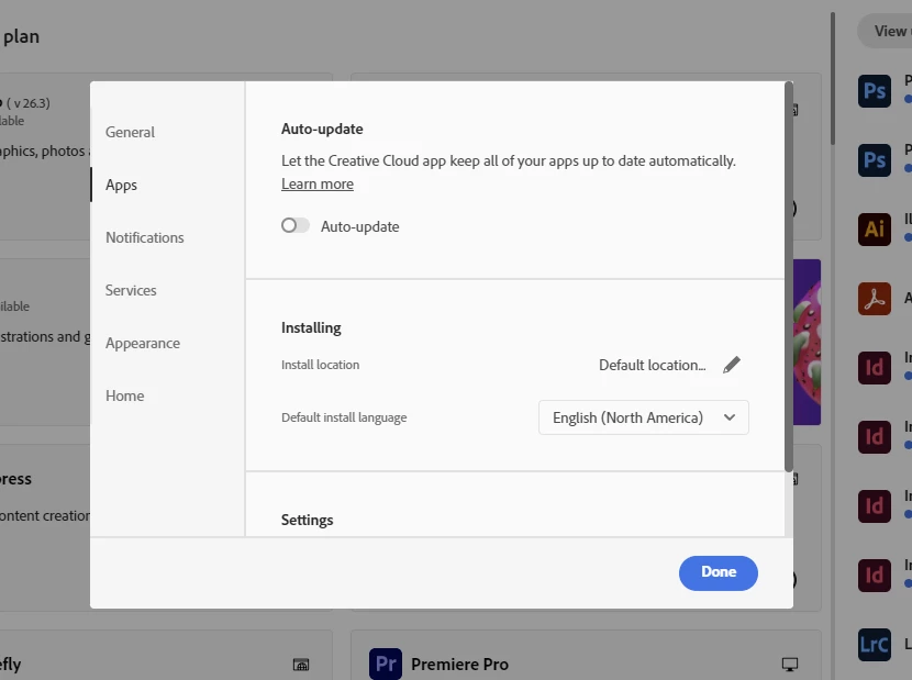 all my settings are on Dutch (Nederlands). Still, when i open photoshop and lightroom classic, they present in English. I followed the selfstudieguide, but when i open the app-side, i can't set any settings for in stalling.