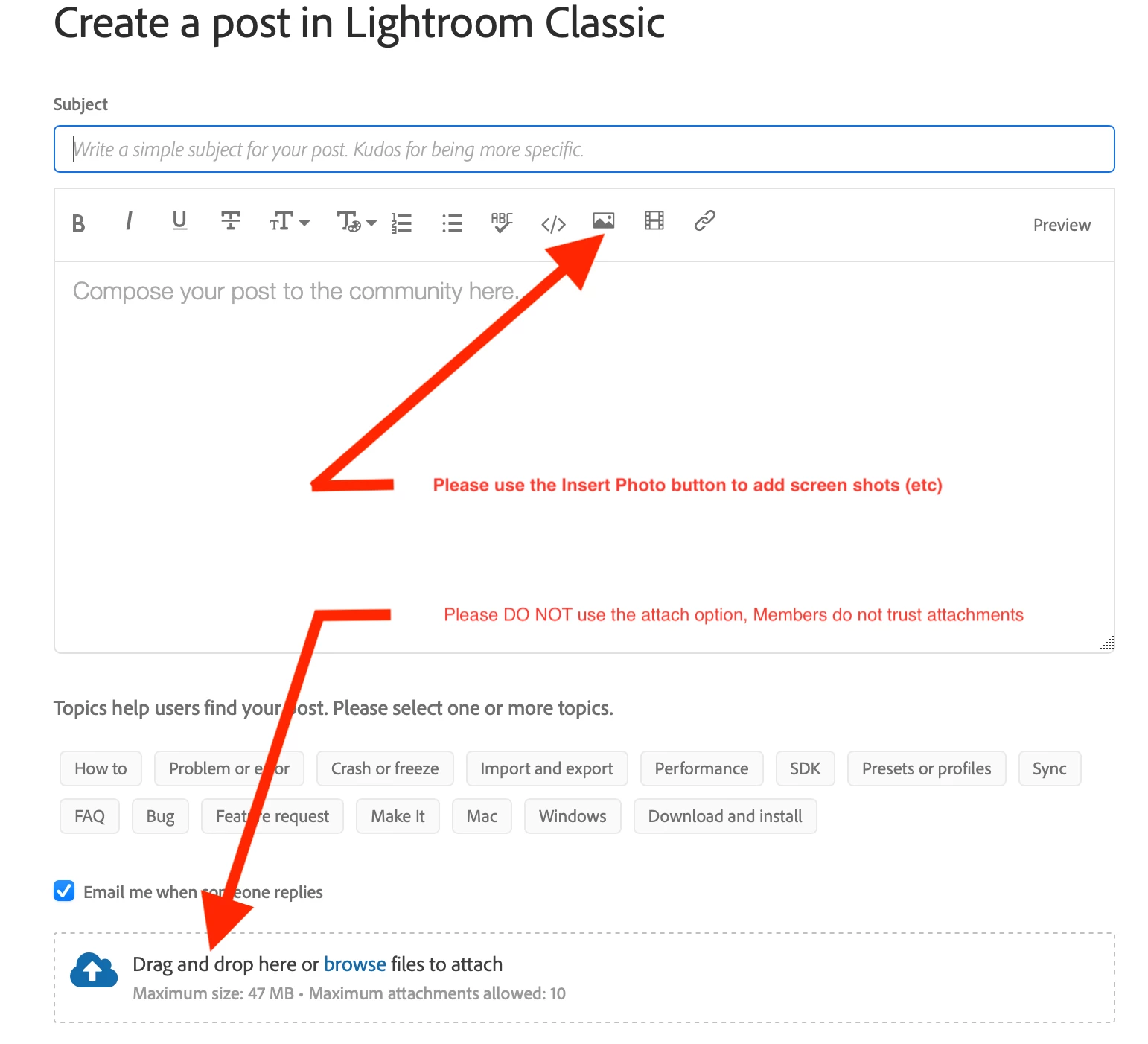 see " Add screenshots, images, and attachments' in:   Community How-To Guide - Tips & Best Practices
