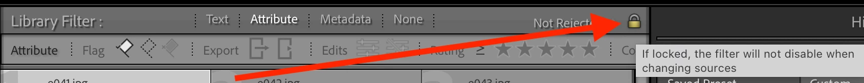 Expected behavoir, Library filter remains on Attribute, new DNG files have the same label and should be filtered in and shown as they are created.
