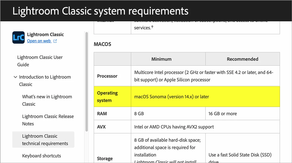 Lightroom Classic 14 supports macOS 13, 14, and 15.