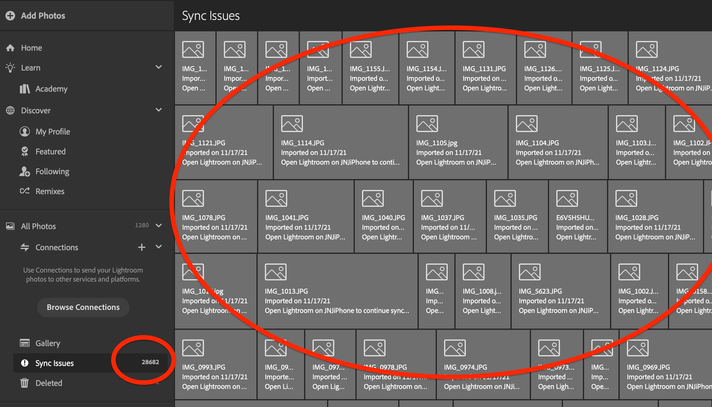 I have Lightroom classic and keep my images on my own on-premise storage. Somehow, sometime, Lightroom sync got turned on and it tried to load 31,000+ images onto my cloud. If I did this I do not know how. I now have run out of 100 GB of Adobe Cloud storage and 28,600+ sync issues, which I assume is what is eating this storage. I can see that I can delete those sync issues (images) one by one, but that is insane. How do I delete the Lightroom sync issues and stop loading my on premis images in the cloud. How do I get rid of the 28k+ sync issues?