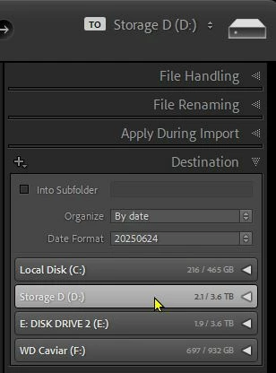 When you Import photos from your camera SD card, you set the Import option to [COPY] from the camera card, and in the Destination panel of the Import dialog you set the Destination of the files to be the external SSD.