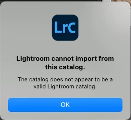 Lightroom cannot import from this catalog. The catalog does not appear to be a valid Lightroom Catalog.