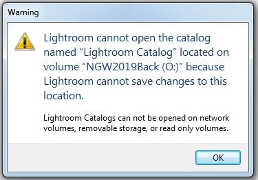 As a result, I carried on using the second hard drive as labelled above. Again, for about a month I have had no issue. Today I closed out of Lightroom and then went back to it later and got this message. Same as what happened on the first external.