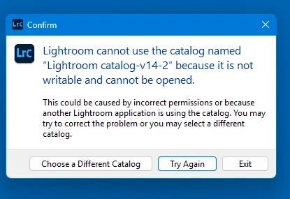 lightroom cannot use the catalog named "Lightroom catalog v14-2" because it is not writeable and can
