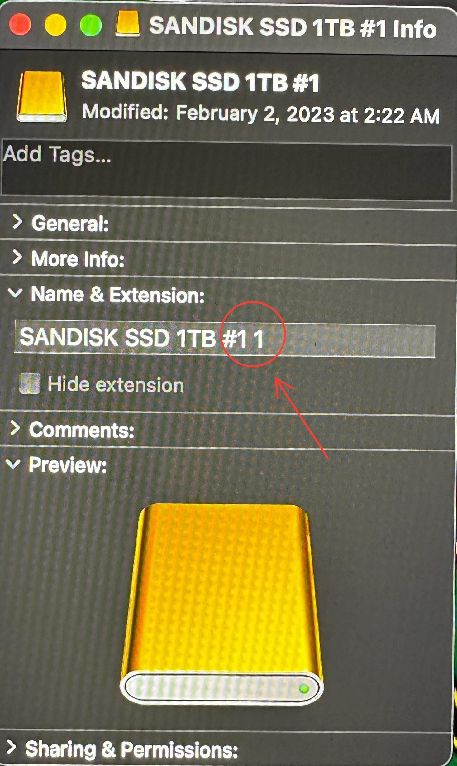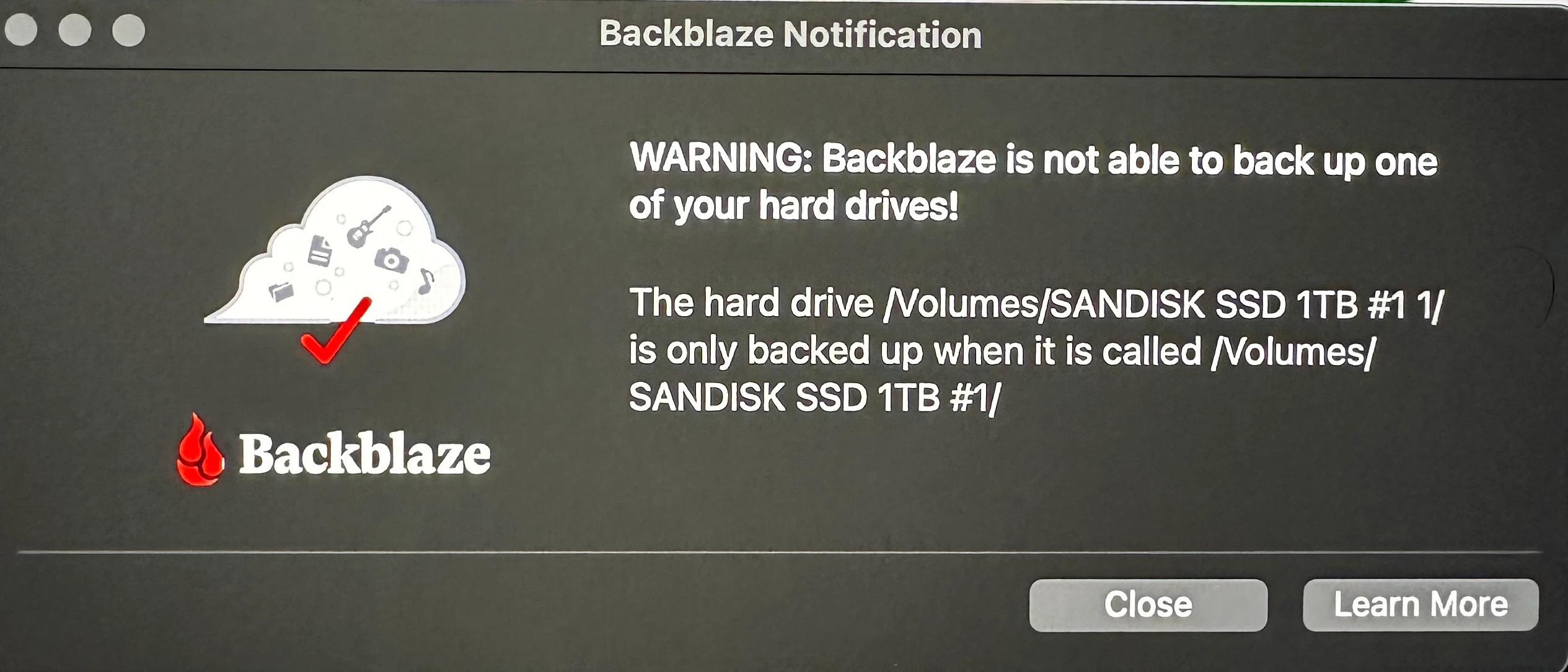 I have noticed in the BackBlaze image that it's saying SanDisk SSD 1TB #11. So I included an image showing the info from the SSD folder on MacBook and it shows the same thing about #11? Not sure where this #11 came from. It always been named SanDisk SSD 1TB #1.