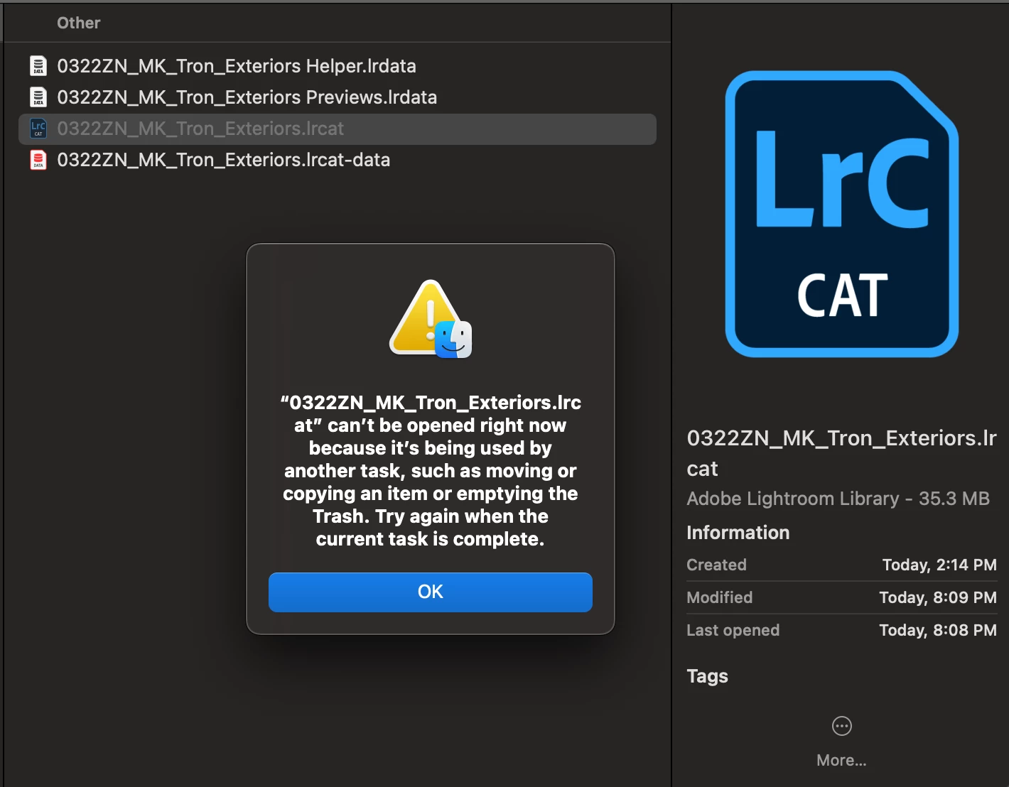 Restarting doesn't help, emptying the trash does not help, and no other instance of Lightroom or any other Adobe program is running while trying to open these catalogs.