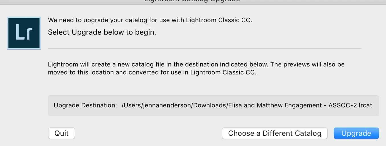 If you still get that same message about Upgrading the catalog then you must of been using a older version of LR, like LR CC 2015.x, and somehow upgraded LR to the newer LR Classic CC V7.
