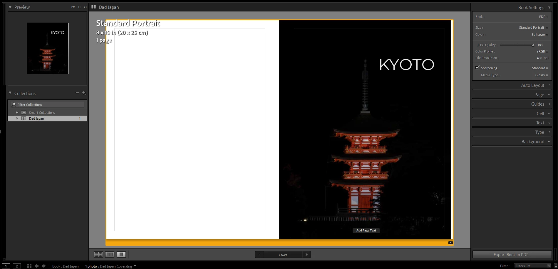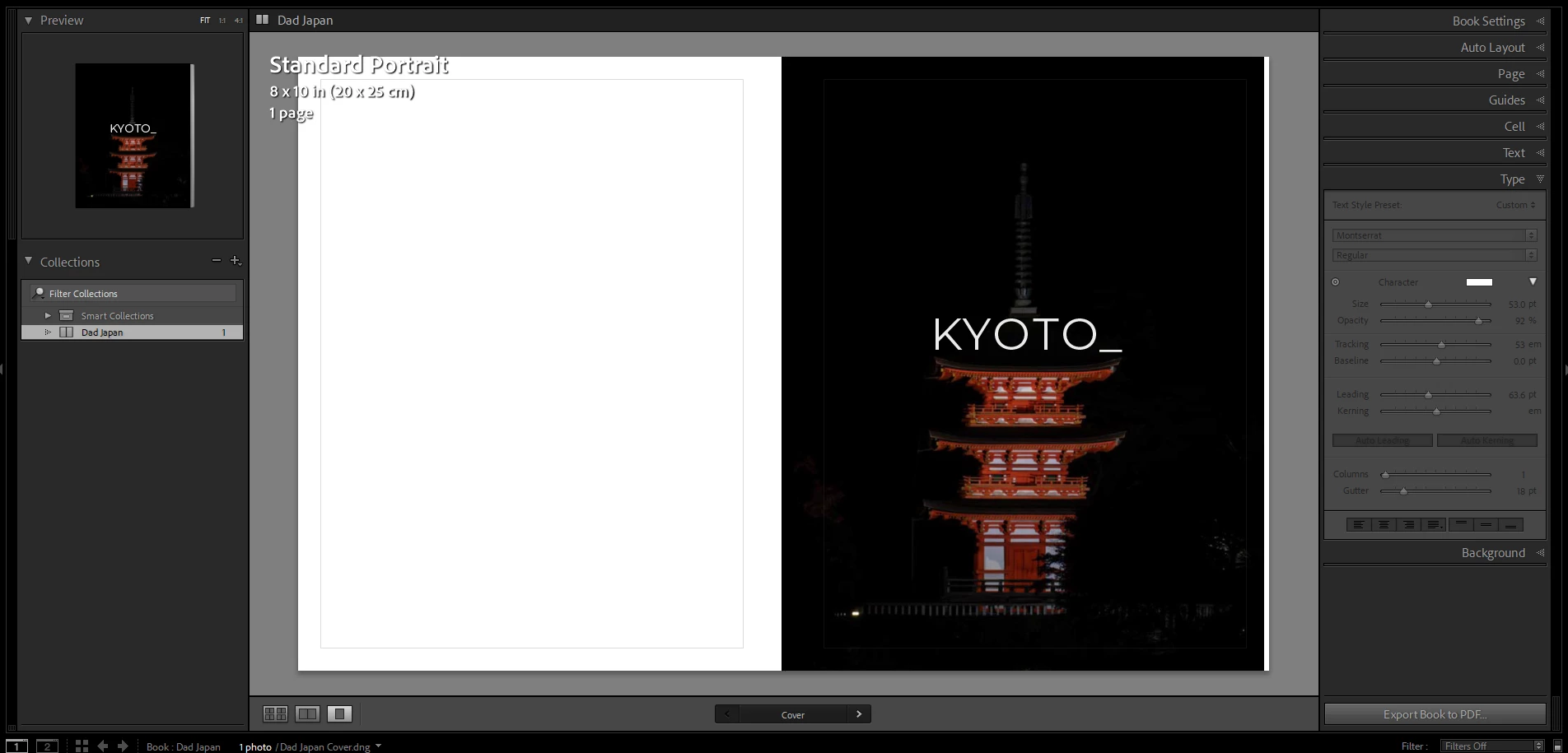 In the Lightroom preview, the text "KYOTO" is alligned with the apex of the pole. But when I export the book either to PDF or JPEG, the text is cleared not at the same position relative to the image.