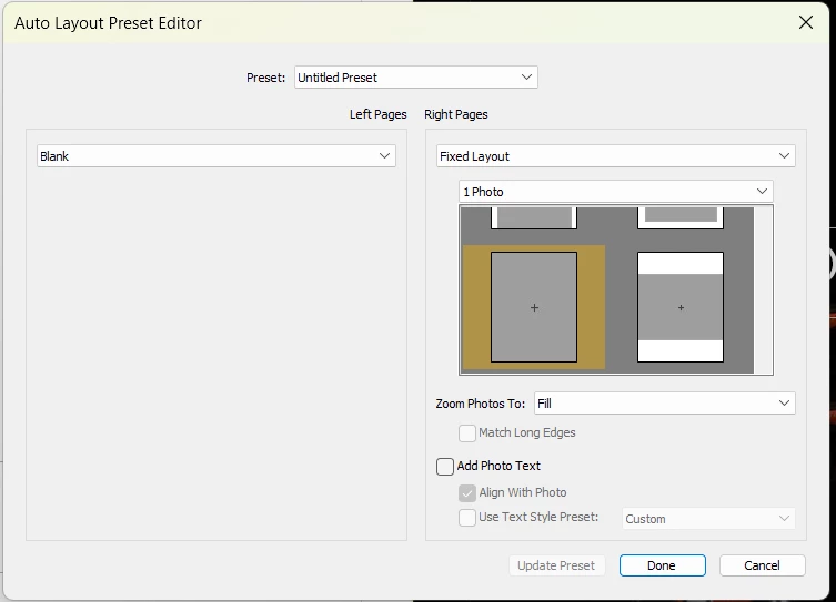 In the layout option, I tried both "Fill" and "Fit" for the option "Zoom Photo to:", but nothing changed.