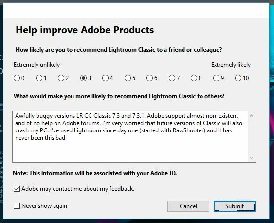 Awfully buggy versions LR CC Classic 7.3 and 7.3.1. Adobe support almost non-existent and of no help on Adobe forums. I'm very worried that future versions of Classic will also crash my PC. I've used Lightroom since day one (started with RawShooter) and it has never been this bad!