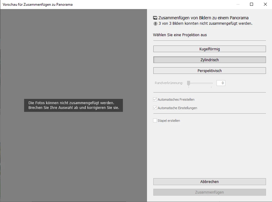 Habe heute bemerkt, dass ich keine Fotos mehr zu Panoramen zusammenfügen kann. Mit der Vorgängerversion hat es sehr gut funktioniert. Wenn ich Fotos selektiere und Fotos zusammenfügen wähle wird das Vorschau-Fenster wie gewohnt geöffnet und ich kann die verschiedenen Projektionen auswählen doch ein Zusammenfügen ist nicht möglich.