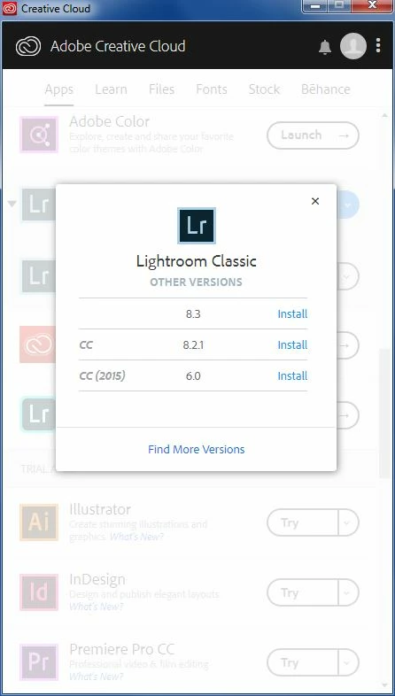 On the Windows 8.1 computer, Creative Cloud shows v7.5 as the most current version (since LR 8.x is not supported for Win 8.1) and the following "other versions" as available: 7.4, 7.3.1, 7.3, 7.2, 7.1, 7.0 and 6.0 (CC 2015). On the Windows 7 computer, Creative Cloud shows v8.4 as the most current version (since LR 8.x is supported for Win 7) and the following "other versions" as available: 8.3.1, 8.3, 8.2.1 and 6.0 (CC 2015) - but not 7.x. See screen shots: