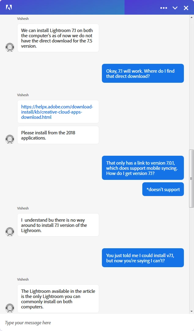 I've tried using the direct download of version 7.0.1, but that version won't support mobile syncing, so I have to upgrade to v7.1 or above - which I can do on the Windows 8.1 computer, but not the Windows 7 computer. There does not appear to be a direct download version of v7.5.
