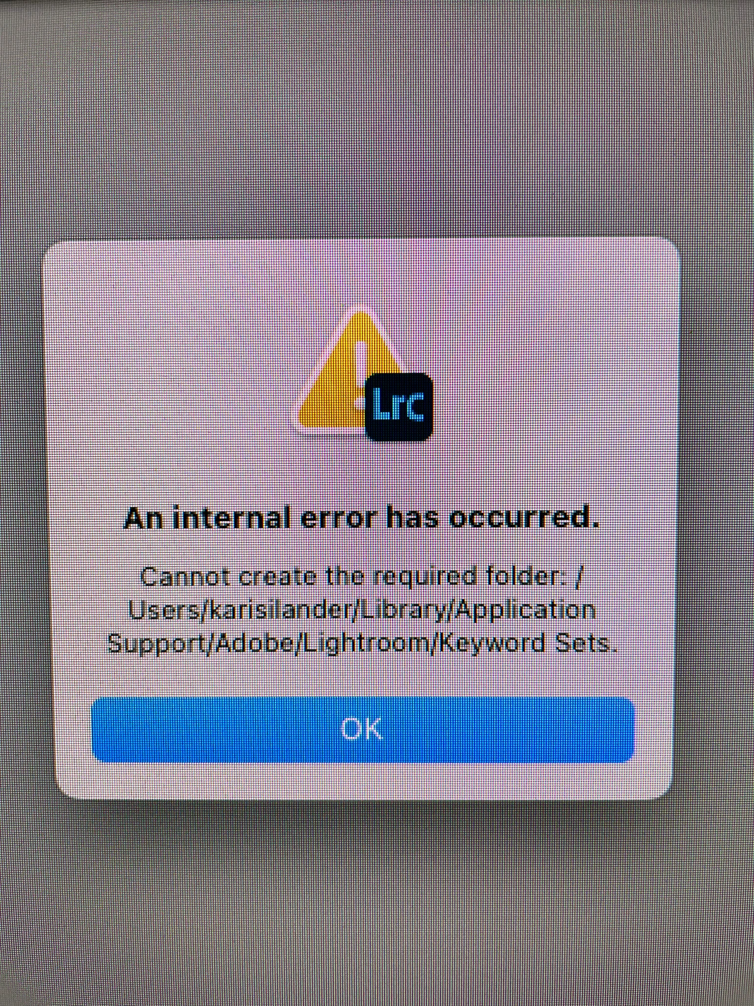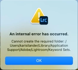 Go to the folder that is mentioned in the dialog (user/karisilander/Library/Application Support/Adobe/Lightroom) and check it. Maybe you have an alias or another type of file named 'Keyword Sets' in there. Even with full disk access Lightroom can't overwrite a file with a folder.