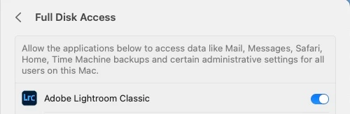 Apple changed the security requirements in MacOS Monterey and later. Go to MacOS 'System Settings - Security & Privacy' and add Lightroom Classic to "Full Disk Access". Click on the lock icon to unlock the settings, then click on the plus icon to add Lightroom Classic if it isn't already listed. If it is listed, then just enable the checkbox. See also Quick Tips: How to give Full Disk Access to Lightroom Classic on macOS