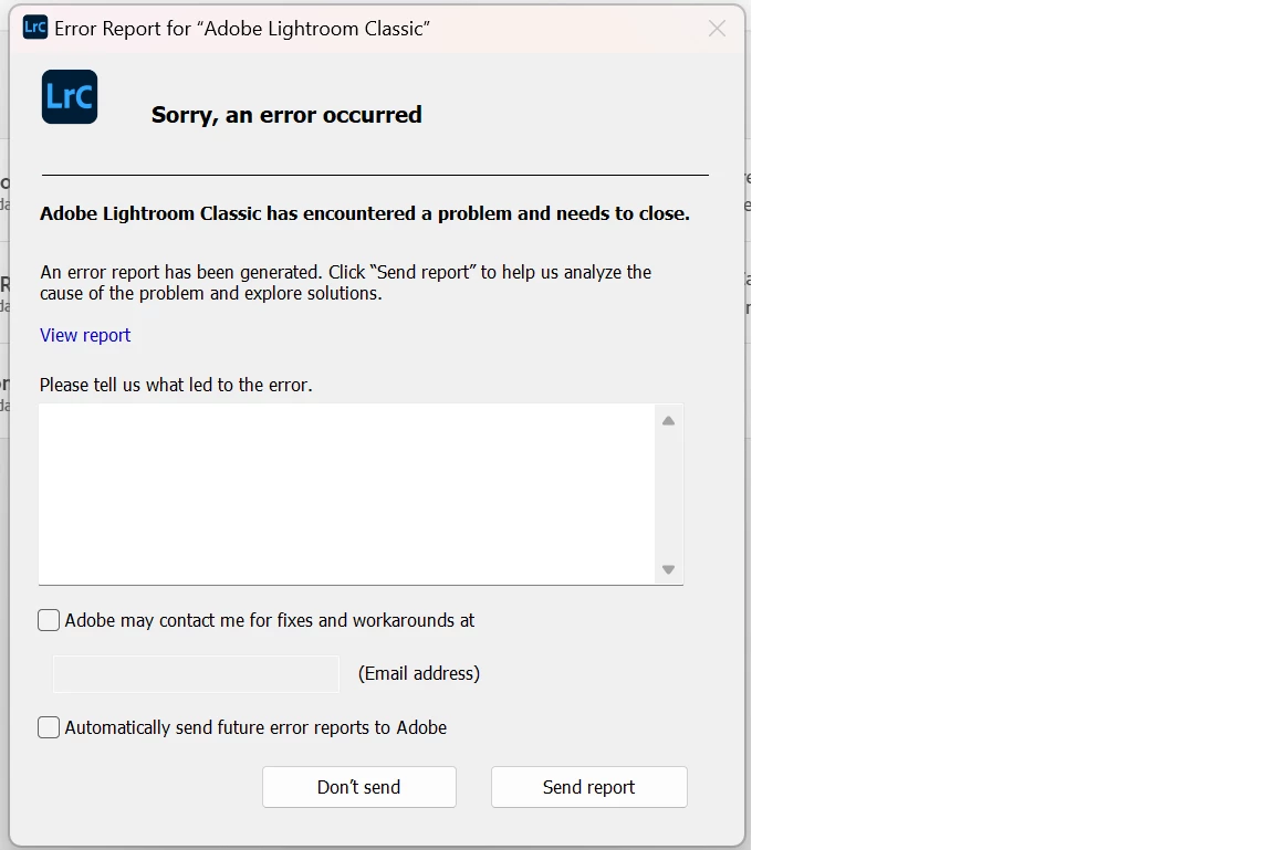 <crashreport serviceVersion="13.2.0.202308091502_65b8636" clientVersion="13.2.0.202308091502_65b8636" applicationName="Adobe Lightroom Classic" applicationVersion="13.0.2" build="[202311290958-8ff975ea]" source="Windows-Client" crashType="n/a">