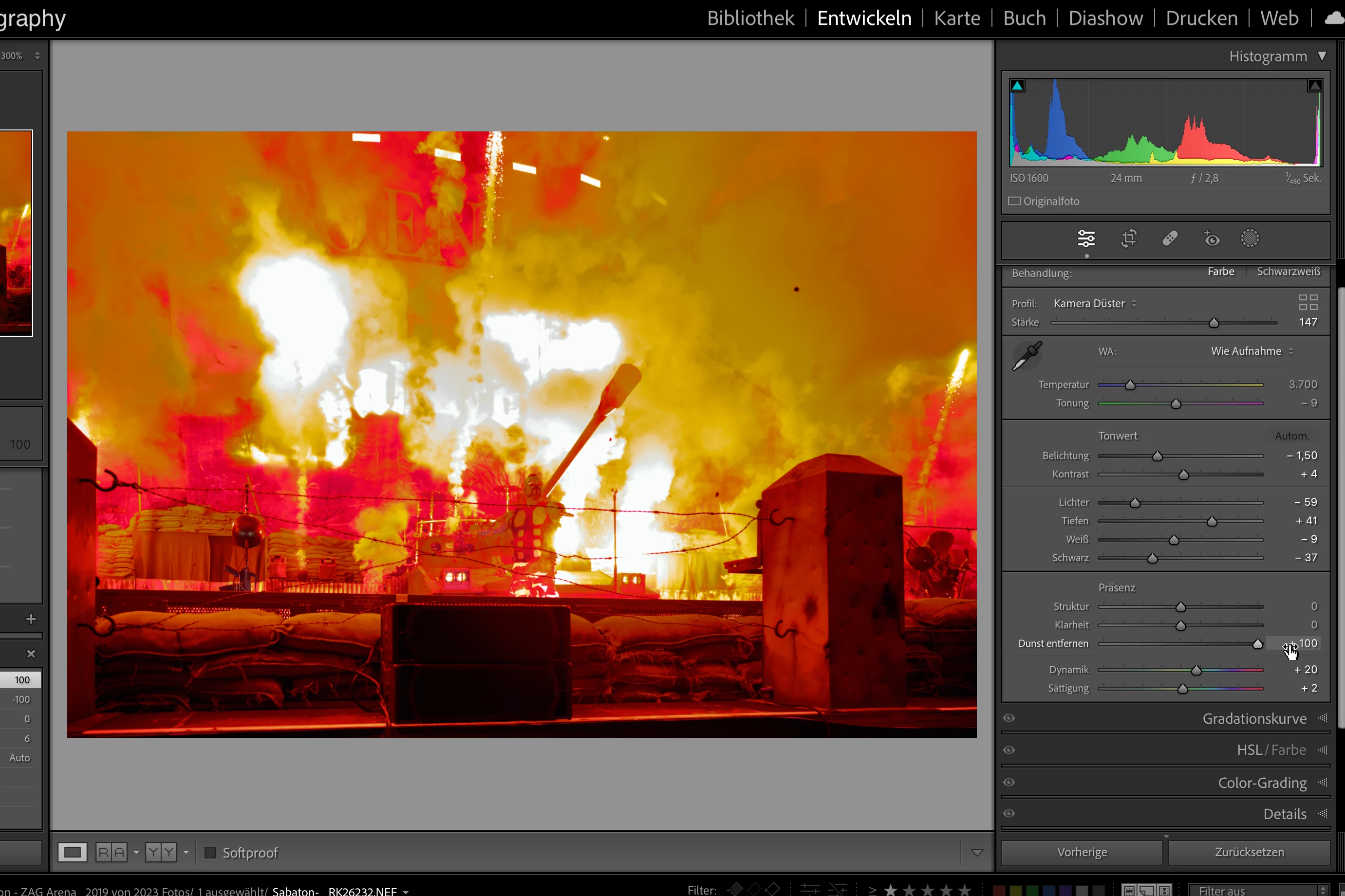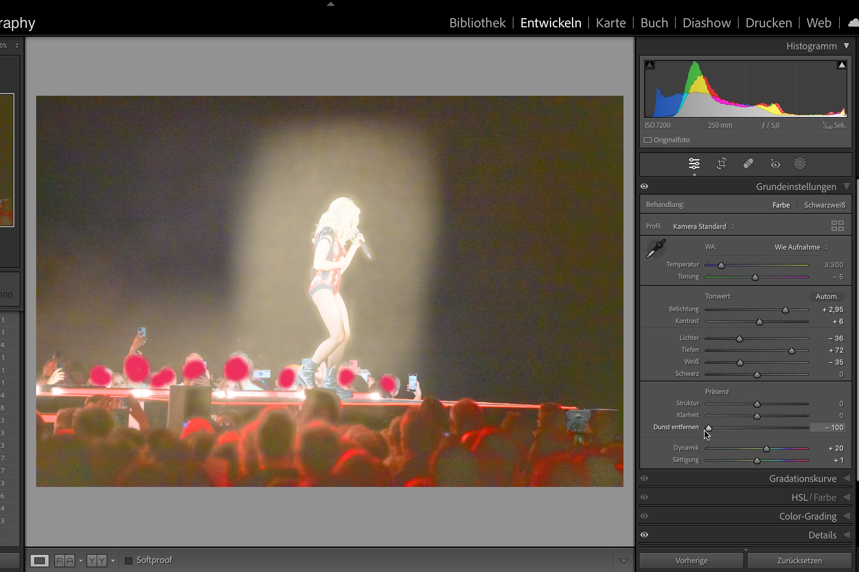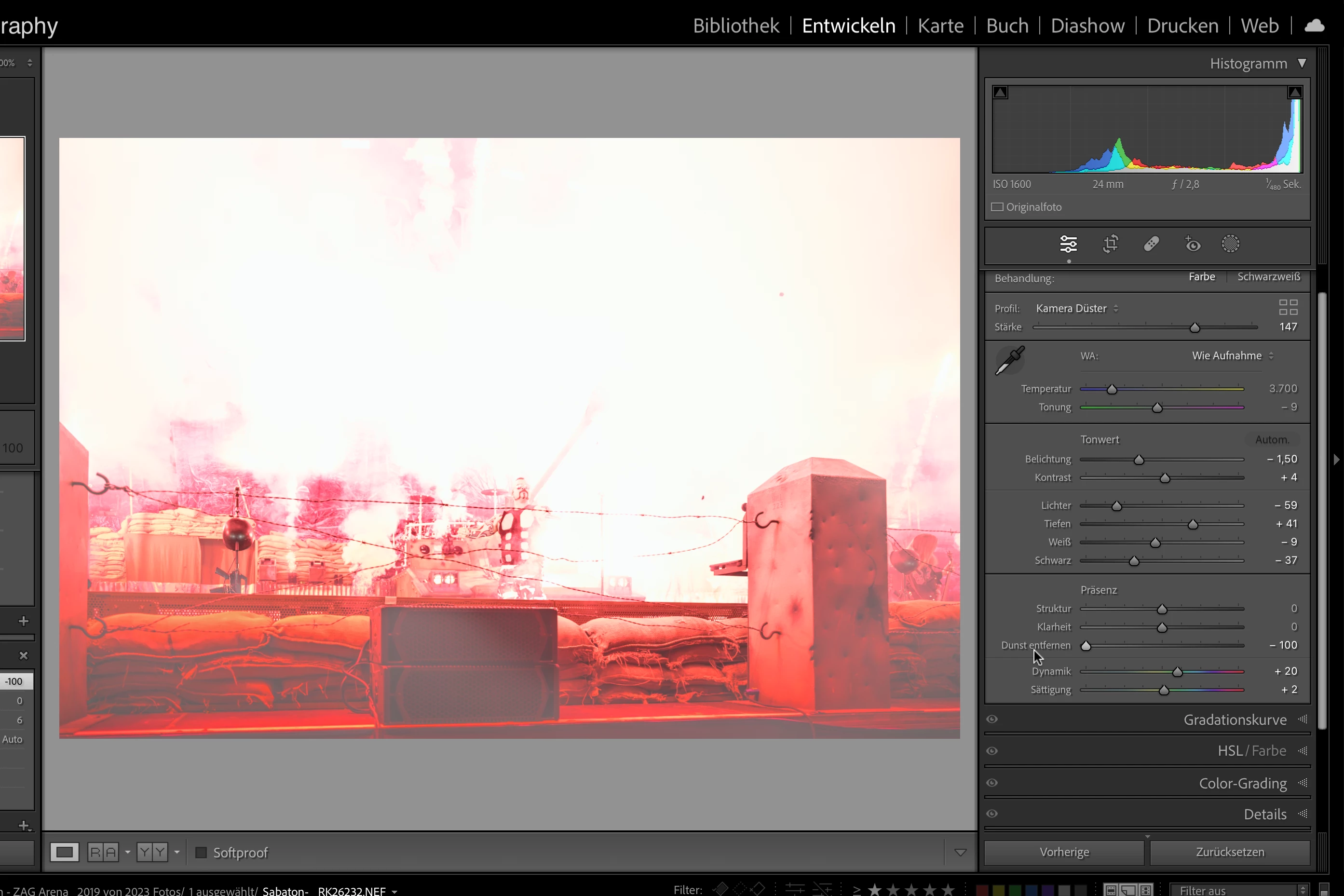 With update to LR-C 12.4 (please recognize in system parameters that I switched back to 12.3 to be able to keep working) the Dehaze Function behaves strange. There is a small amount in the middle of the image where a strange effect is to be seen. I provided two screendumps with min and max values of the slider. Please note that the image isn't edited but only to show effect better, otherwise it's for the bin 😉