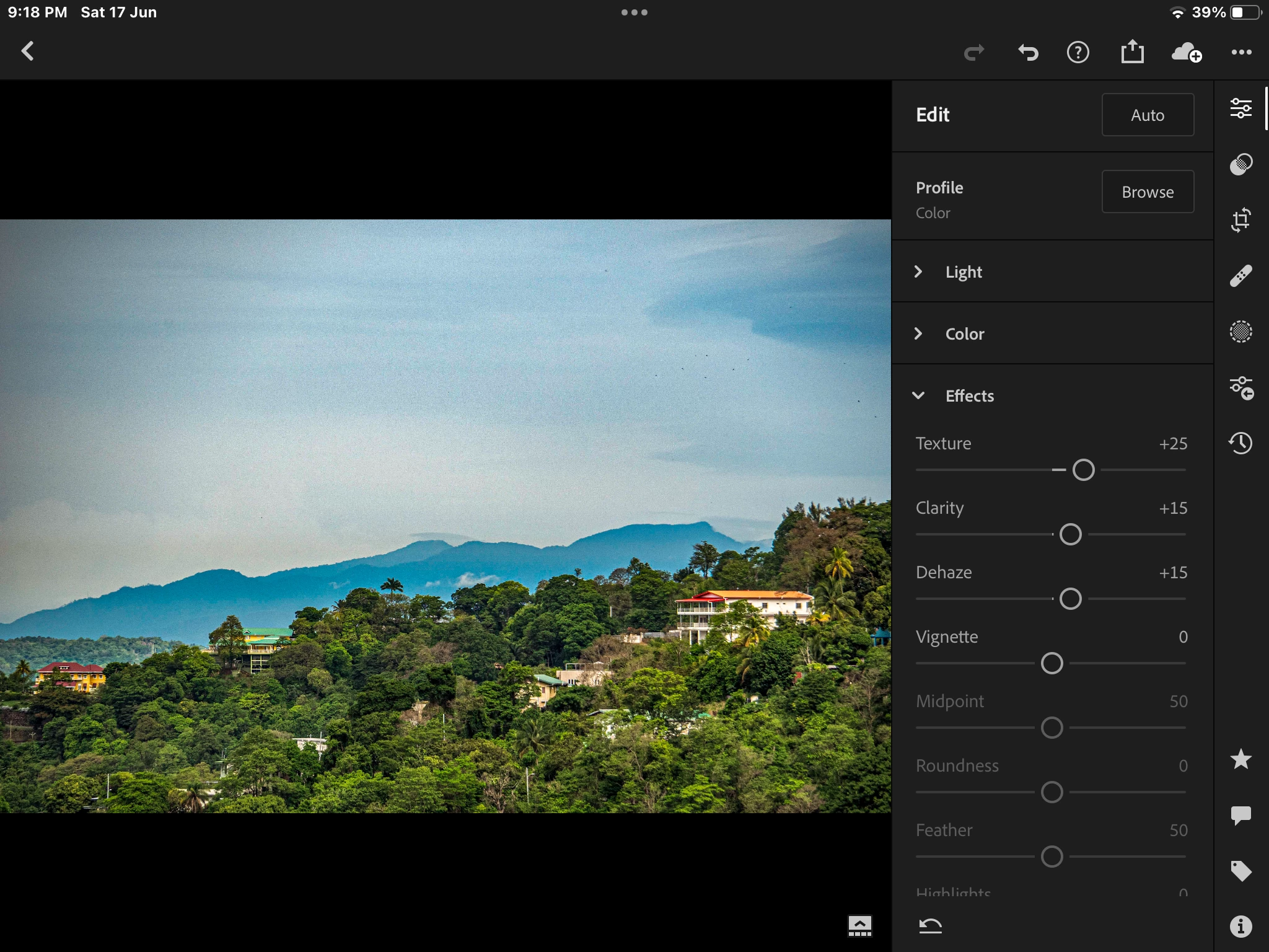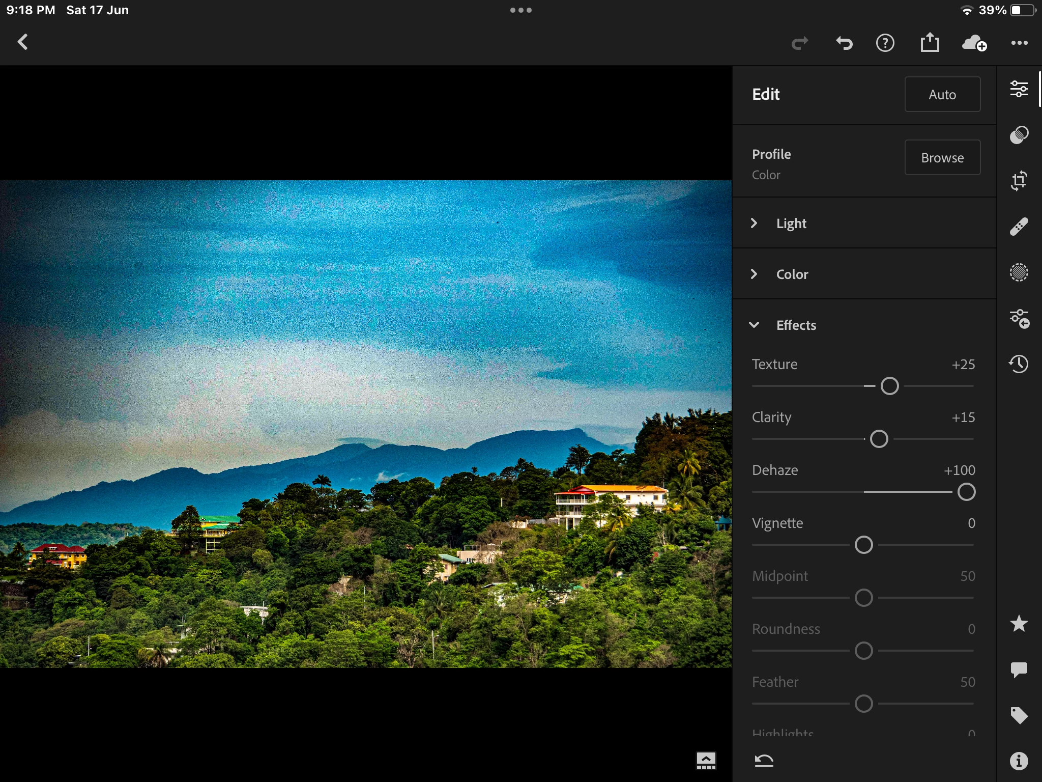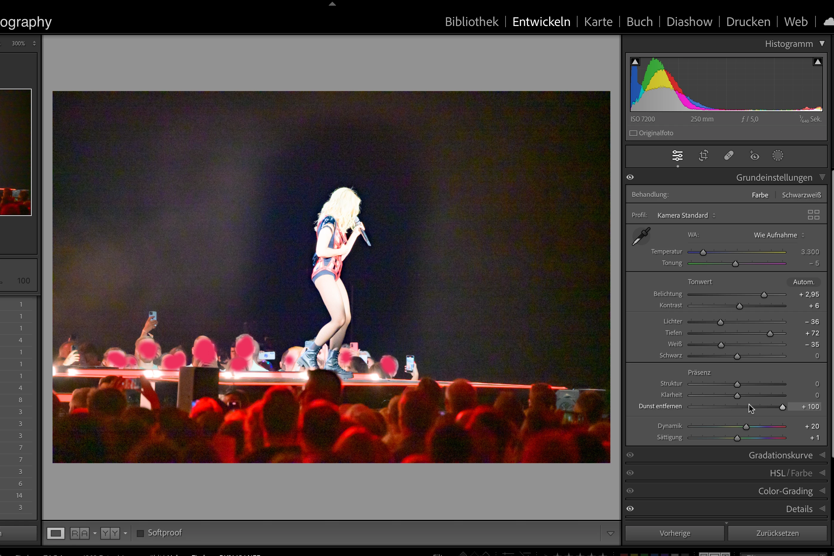 With update to LR-C 12.4 (please recognize in system parameters that I switched back to 12.3 to be able to keep working) the Dehaze Function behaves strange. There is a small amount in the middle of the image where a strange effect is to be seen. I provided two screendumps with min and max values of the slider. Please note that the image isn't edited but only to show effect better, otherwise it's for the bin 😉