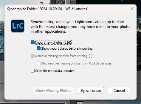 When I try to synchronize the folder again, the first pop-up window shows that some files must be imported. But then when I hit synchronize, no new photo are display, as if there are already considered part of the catalogue.