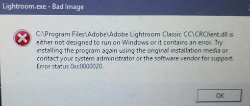 Lightroom Classic: Failed to open: CRClient.dll Error 0xc0000020