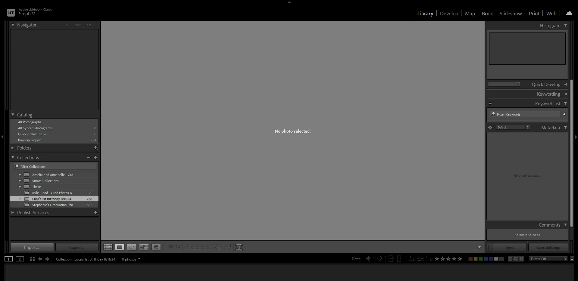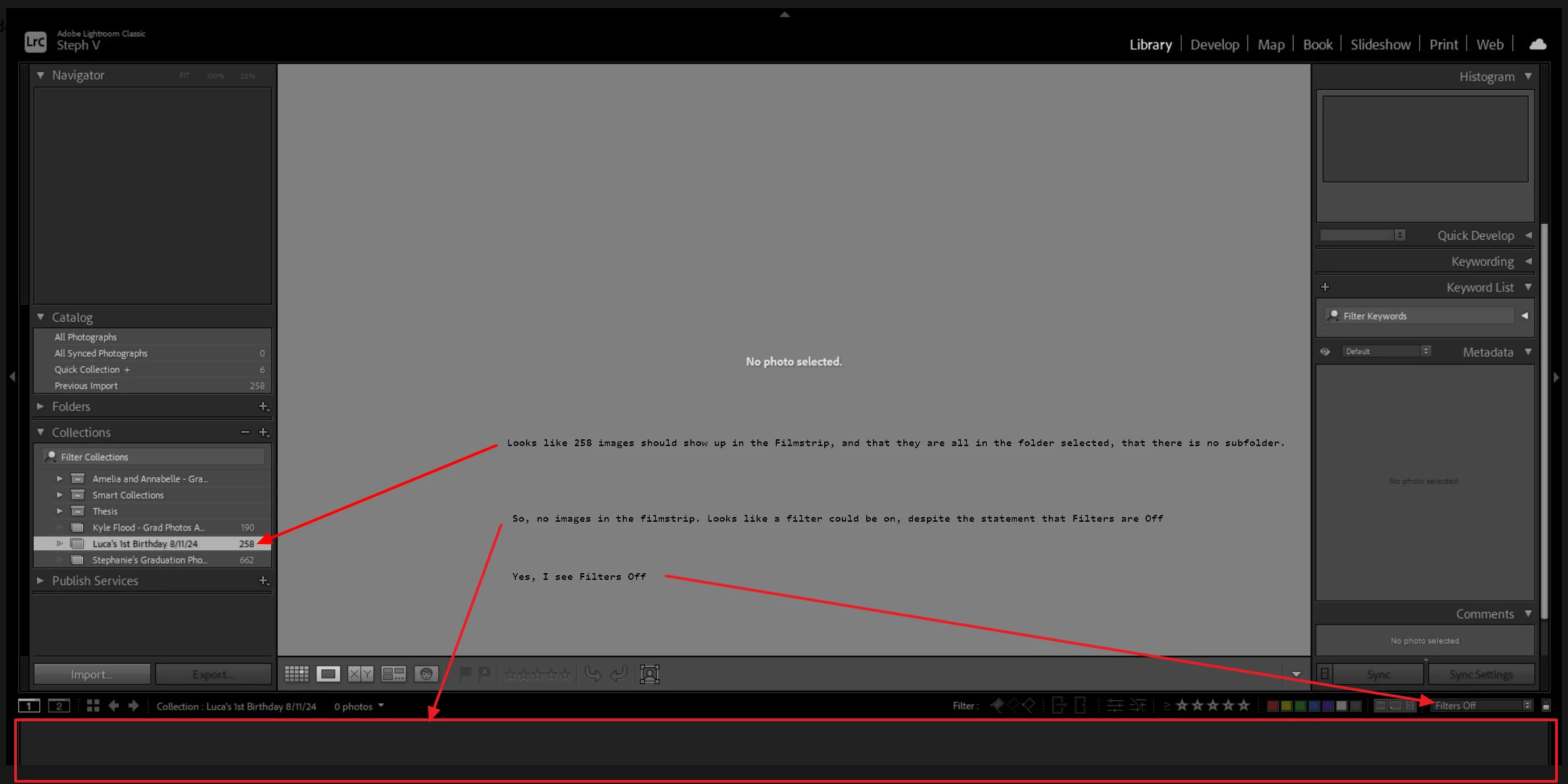 Recently I imported photos in, added it to a collection and started to rate them. I noticed as I was rating them 1 star or changing some back to 0 rating. It wouldn't take away the 1 star. I didnt think much of it because when I do a second round of selecting it would go away. When I clicked on the fliters section to see all of the photos I rated 1 star it woudn't show me and said there were no photos in this collection even though on the side it showed 258 images in the collection. Additionally the "previously imported" section also said 258 photos and when I clicked on that it said there were no photos. It also no longer shows an amount of photos next to the "All Photographs" section.