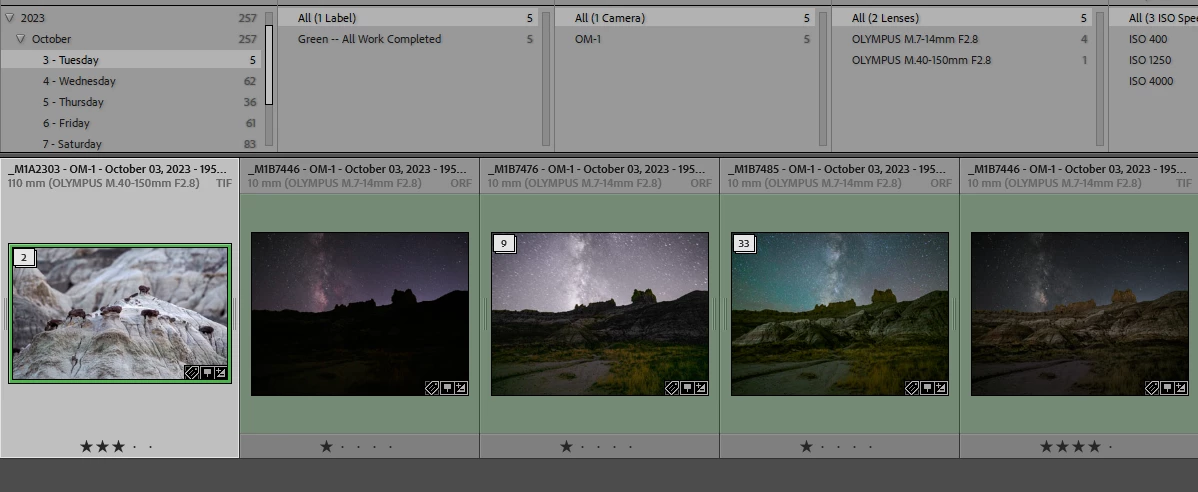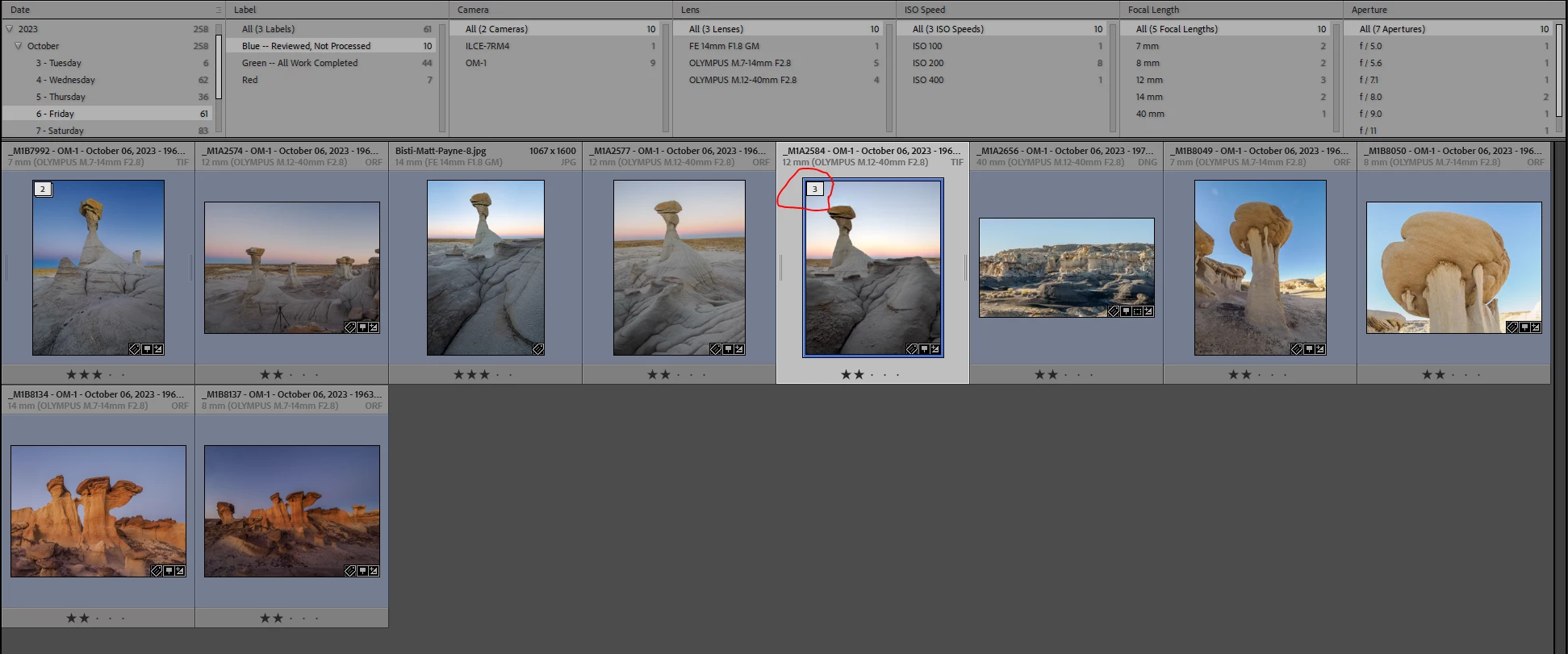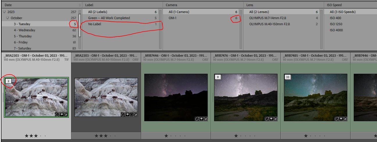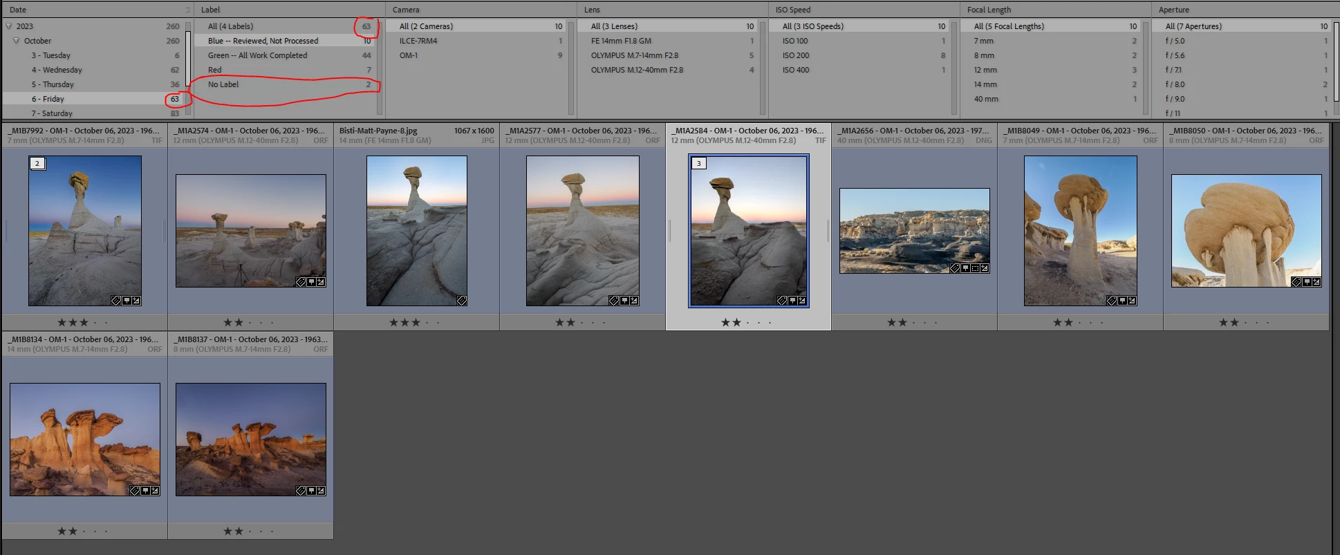 Clicking to open the first stack displays the 2nd image in the stack, and updates the “label” filter to show there’s one “No Label” image. But note that the date filter still shows only 5 images for Tuesday, Oct 3 while Label, Camera, etc show 6.