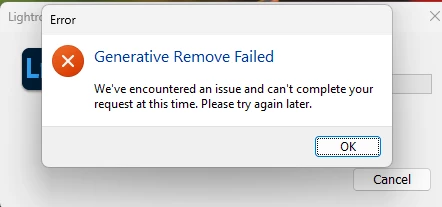 I got on Lightroom Classic to edit some photos, and well I had to use the AI generative remove to remove a part of my image. So like normal I selected it and clicked remove, after that it gave me an error message that said "Generative Remove Failed, We've encountered an issue and can't complete your request at this time. Please try again later." does anyone know how to fix this?