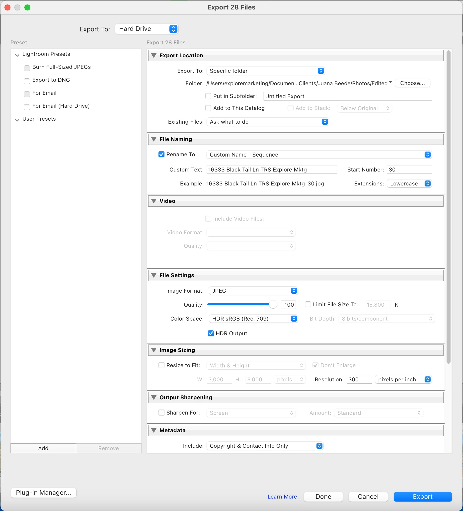 Help! I'm having issues with my Lightroom Classic displaying amazingly edited photos in the Develop screen, but when I go to export them, they're basically looking like SDR. I'm on a newer MacBook Pro M3 Max, my Display is at 1728 x 1117 (Default), Preset Apple XDR Display (P3-1600 nits), Refresh rate of ProMotion, brightness is all the way up, Auto adjust brightness is on, and True Tone is on (in case any of this helps). I'm clicking on the export option for HDR Output, Color Space HDR sRGB (Rec. 709), JPEG with Quality 100. I also turned on the LRC Preferences Presets to Enable HDR editing. One thing that I also did that may or may not make any difference is I brought them into Photoshop to use the remove tool and then saved and it goes back into LRC.