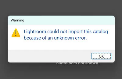Lightroom Classic: Import Catalog & Export Folder to Catalog fails with unexpected error