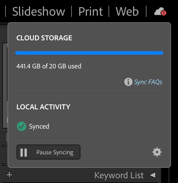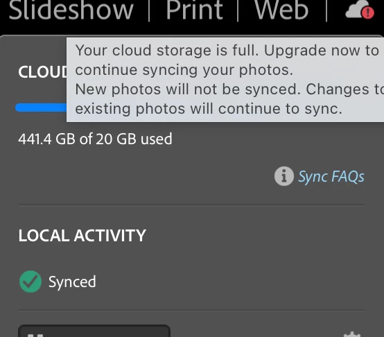 Now in LRC I get the following error messsage in the cloud storage area. How can I fix this? Thanks advance.