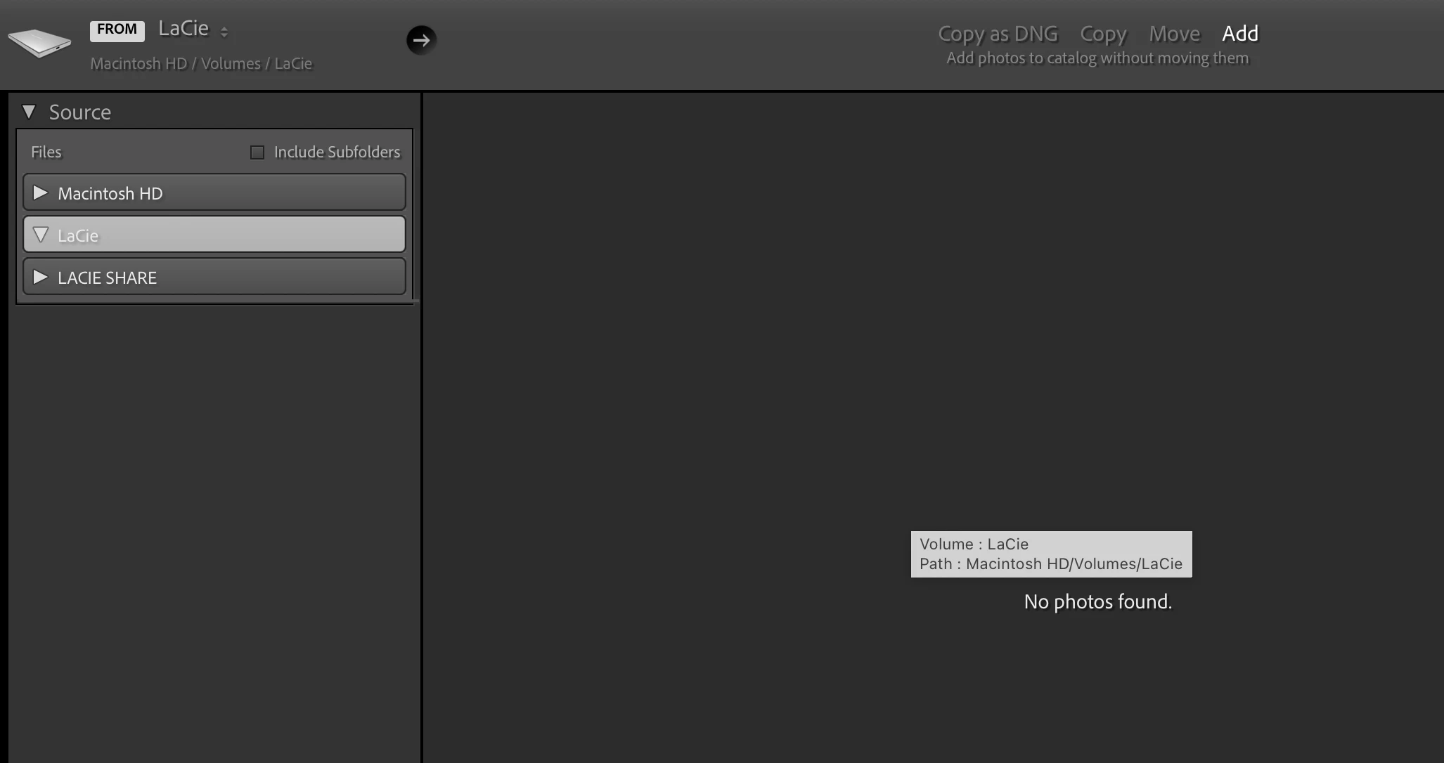 I have used an external harddrive in the past to store my photos. When I go to import now from it, it won't show ANY of the folders. I know it has at one point because my library has the harddrive listed with other folders that have been imported in the past. Lightroom is recognizing the harddrive and that it's connected (because it shows it as an option in the import panel). But it just says "no photos found." As you can see, it show the harddrive, and it's expanded to show subfolders, but no subfolders are showing. (And yes, I have tried with the "show subfolders" box clicked too.)
