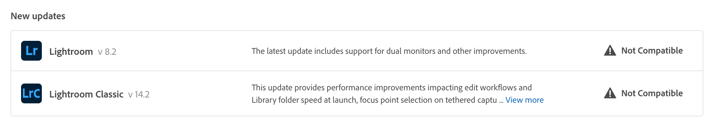 - Updates in my creative cloud for LR Classic and LR are showing as 'Not Compatible' due to my OS