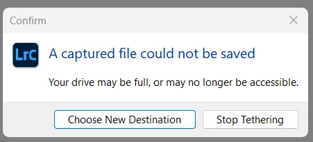 What happened? I was setting all my gear for a photoshoot and I didn't notice that the external drive where I store the tethered shoots was almost out of space. So I shoot for testing and then this message appeared. So I change the location for the files to a drive with enough space, almost a terabyte. But Lightroom continue showing this message. I have restarted LR, my PC, my Nikon D7500, I've already updated the camera firmware, reinstalled LR, check the cable with Nikon Camera Control Pro... But the message still there.