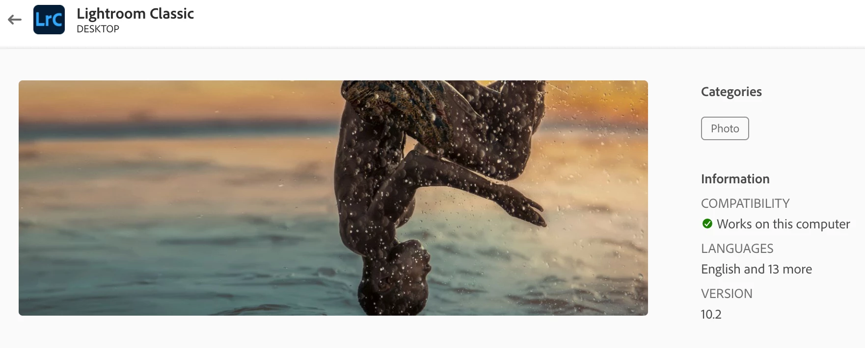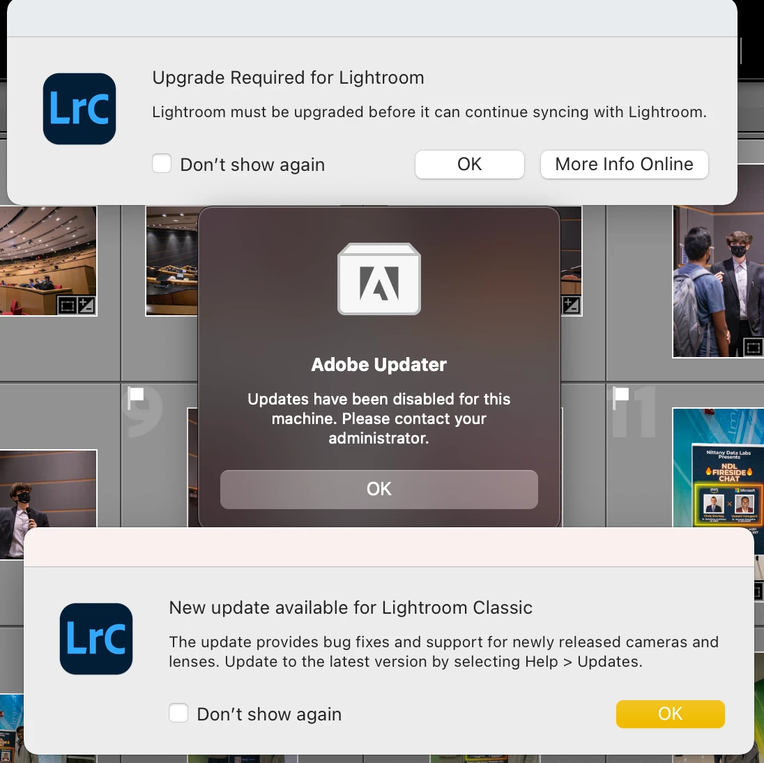 I'm unable to update Lightroom Classic to the newest version. The app gave me messages telling me to update, but I ran into issues. First, going to Help >> Updates leads me to the following screenshot:
