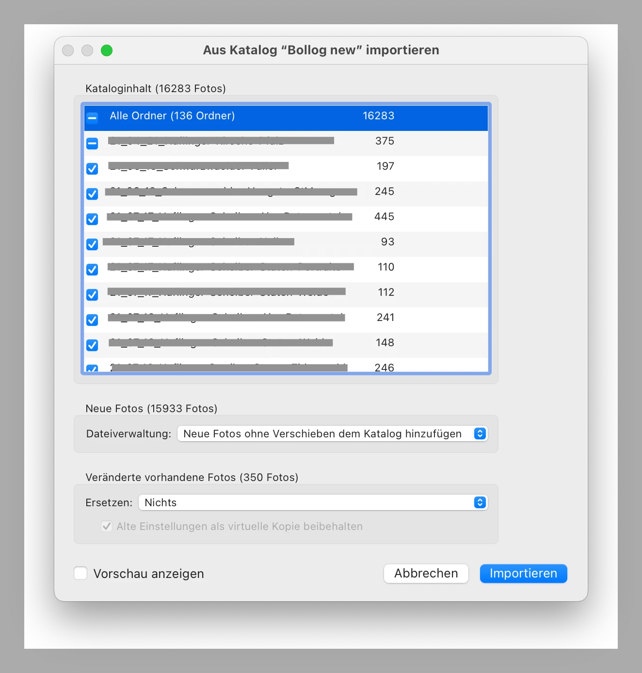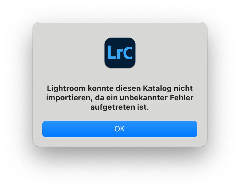 I finally managed to update my old catalogue to the latest version, however I still have issues to import / merge the rest of my photos into my master catalogue. I have merged about 80%, but then I always get the same issue, it basically says "Lightroom could not import this catalogue because an unknown error occurred." (in German "Lightroom konnte diesen Katalog nicht importieren, da ein unbekannter Fehler aufgetreten ist.")