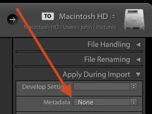 2. In the Import window, make sure Apply During Import > Metadata is set to None: