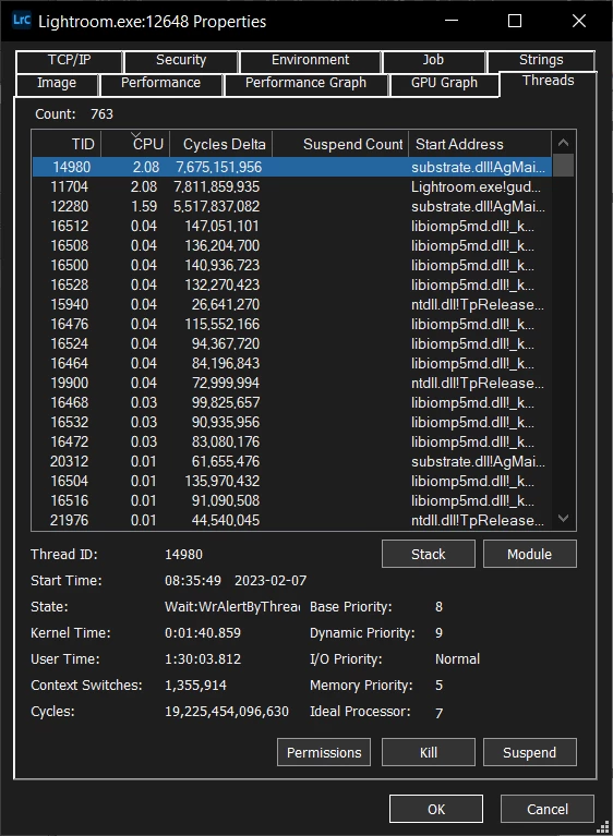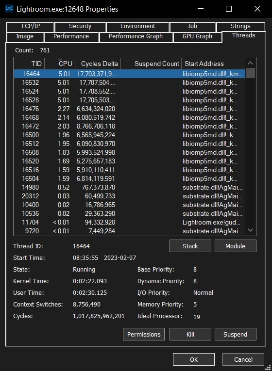 Issue: When running face detection in Lightroom Classic, the thread scheduler does not assign CPU affinity consistently. When Lightroom Classic is in the background, the scheduler tries to put the threads on the Efficiency cores. However, when doing so, it consumes 100% of the usage of the Efficiency cores. When Lightroom Classic is brought back to the foreground, or the affinity set as not to use the Efficiency cores, the issue goes away.