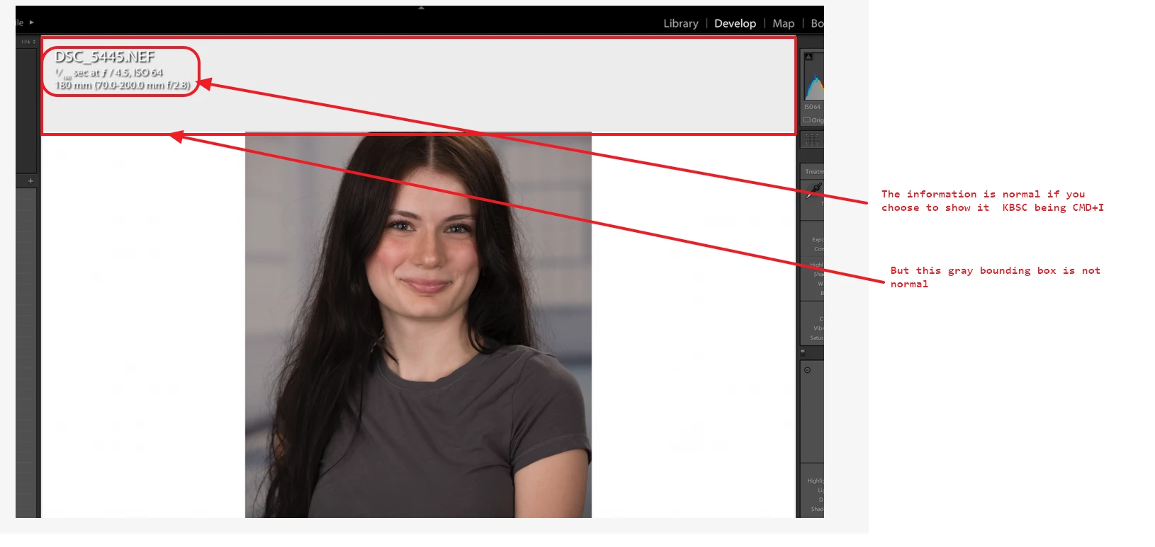 Mmelissag56352980ParticipantForum|Forum|1 year agoAugust 12, 2024QuestionLightroom Grey bar issueForum|Forum|1 year agoAugust 12, 20243 replies215 viewsFor some reason, my LIghtroom window has this grey bar with camera data in it. I can't figure out how to remove it. Please advise!macOS