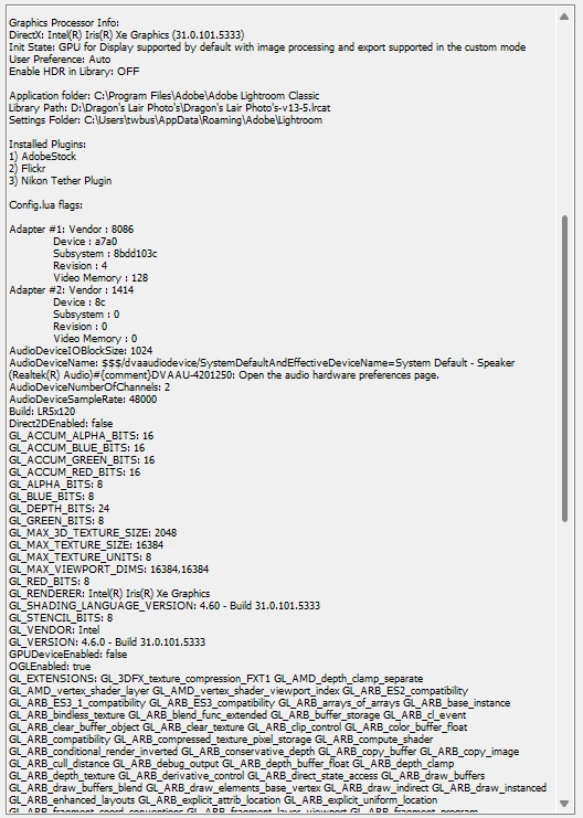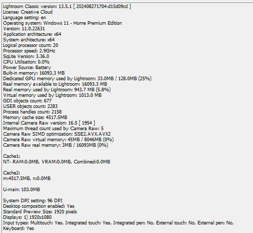 Here is the system info for Lightroom and my Laptop system: