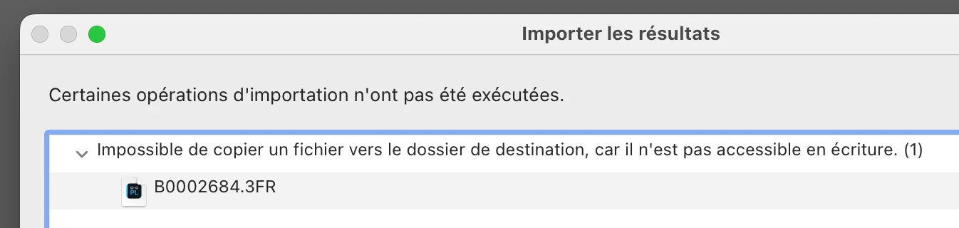 Lightroom & Mac: Impossible de copier fichier vers dossier de destinat° car pas accessible écriture