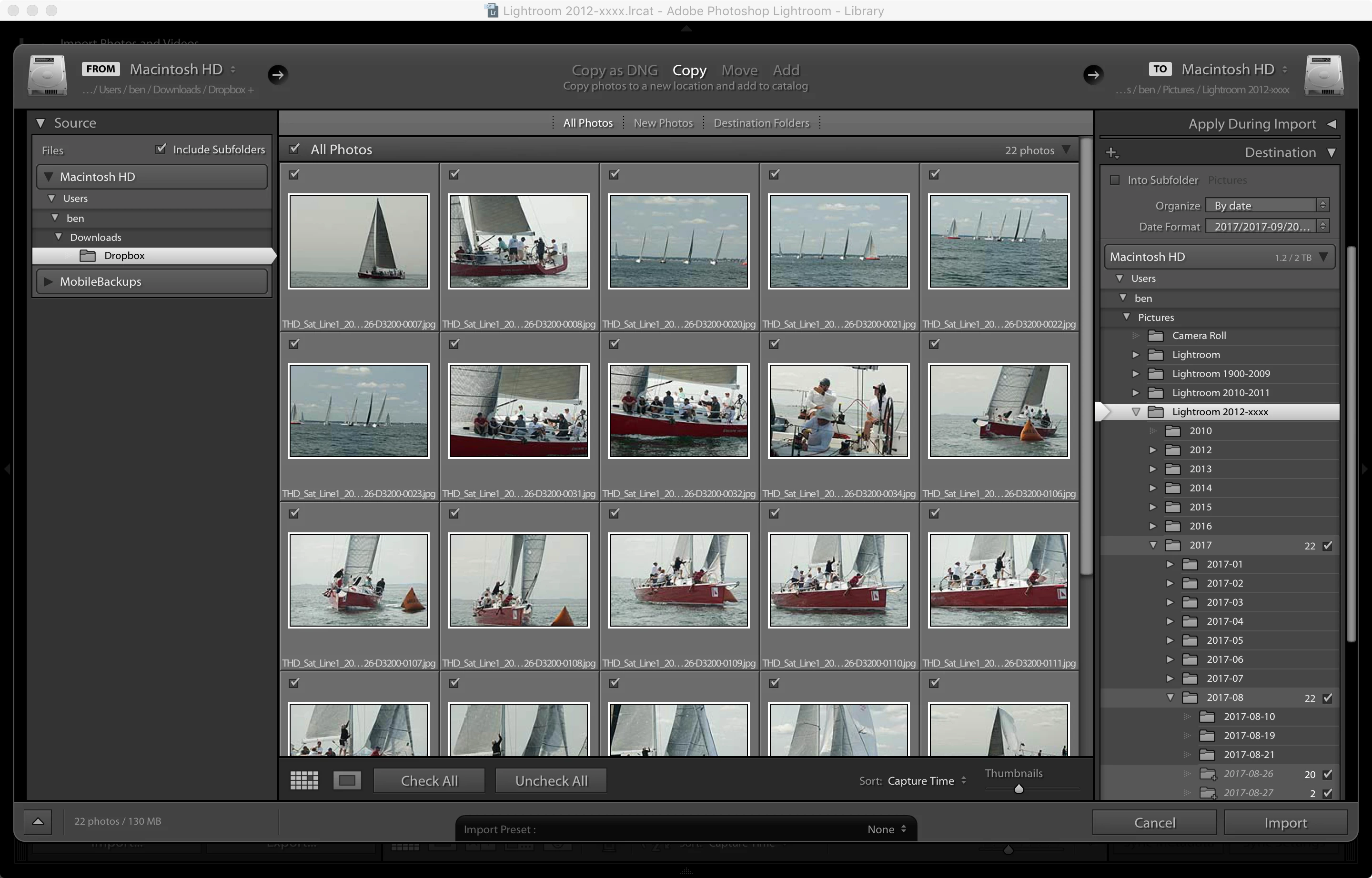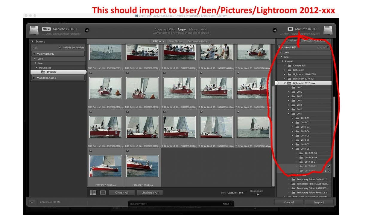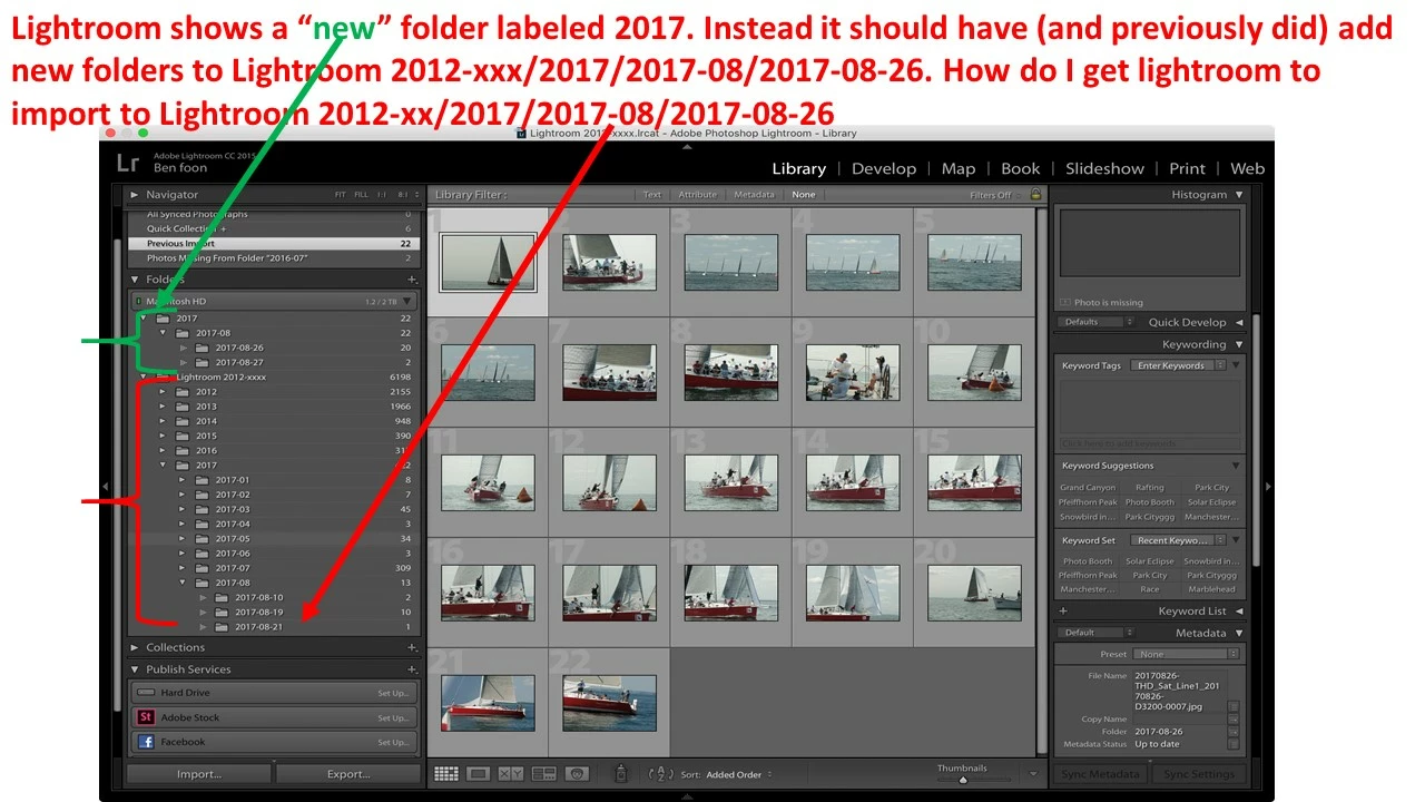 Wow I never would have noticed it. In lightroom the "2017" folder is /User/ben/ however the "Lightroom 2012-xxxx" folder is /User/Ben with a capital "B".