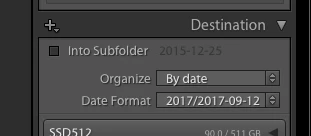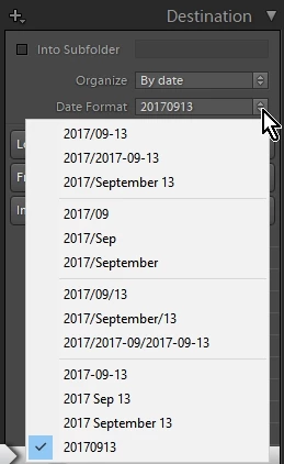 My choice is to use the simplest of options (in the lowest panel of the menu) which is the "20170913" (or 2017-09-13), Then I only have to select (highlight) the Year folder in the Destination panel to get my folder structure as I want.