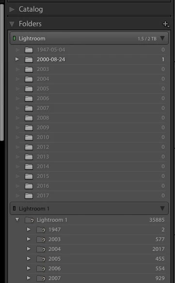 I am seeing a folder called Lightroom1 with the files and folder listed but they all have a ? and the LED is grayed out while I'm seeing a folder called Lightroom with the LED green. If I right click on the folders in Lightroom 1, with the ? and select find missing folders it will import them to the Lightroom folder.