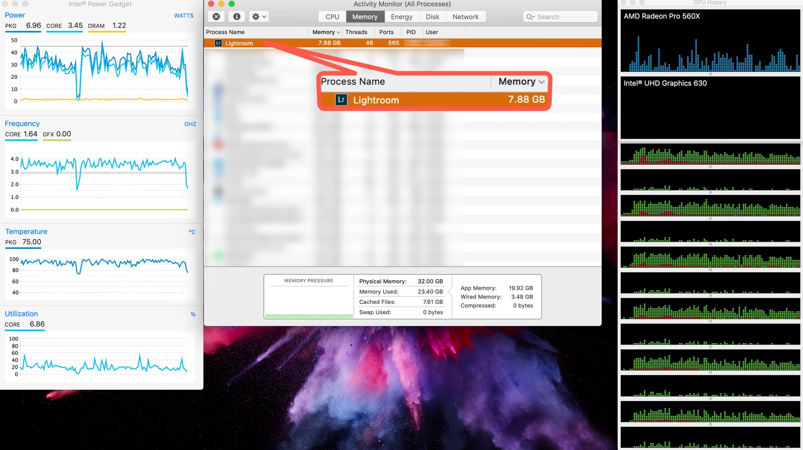 It's also known that Lightroom will take advantage of RAM above 12GB for performance when it's called for. But I'm not sure if that applies to brushing, I think it's more about preview generation.