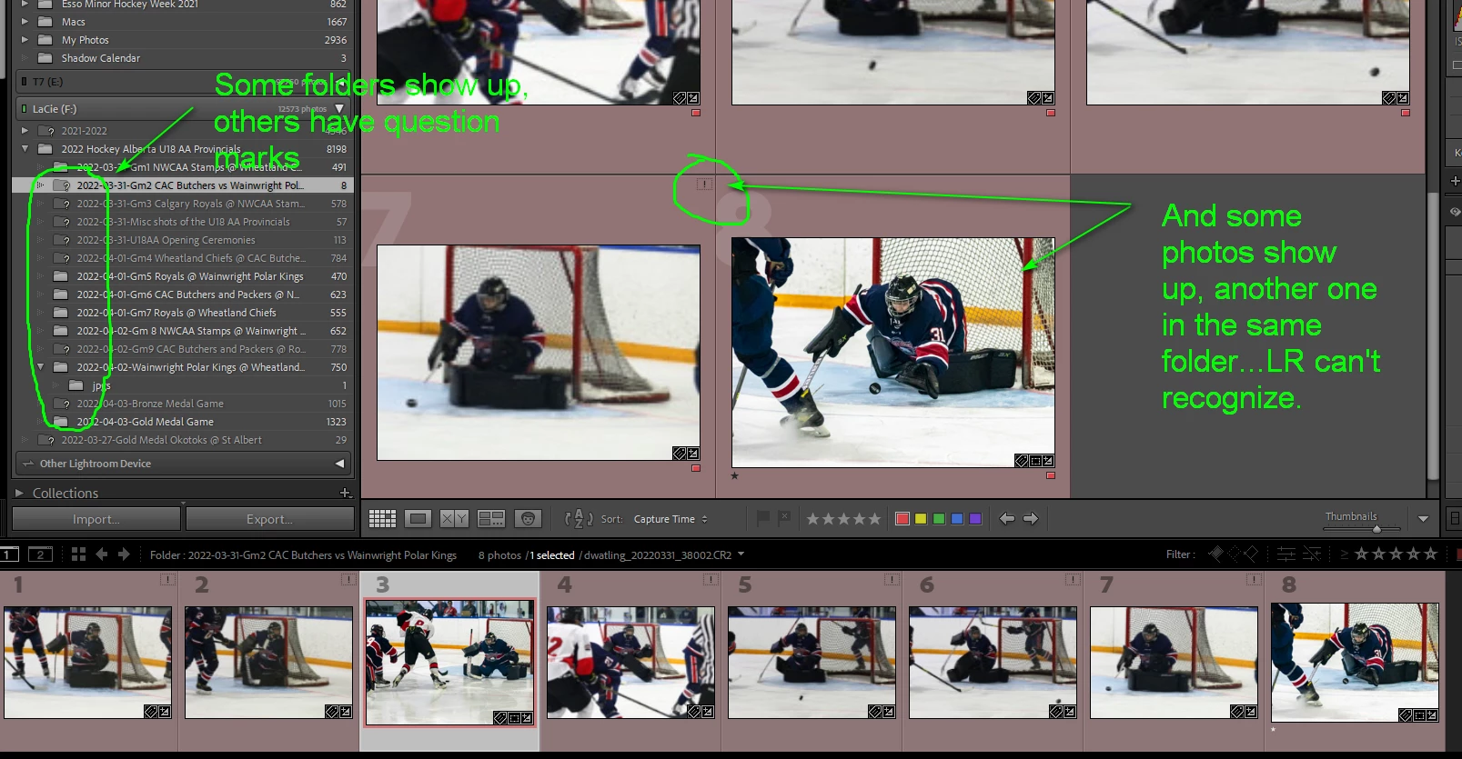 I have an external drive in my library. All folders have been imported in LR. I've been working on and editing a few hundred images over the past few weeks. When I unplug the drive, naturally the library has all the question marks beside the folders. I plug the drive in...they slowly repopulate like normal. All of a sudden, I plug the drive in today, half the folders show normal, but a bunch of others remain with question marks. I go to "locate" the folder, but nothing happens. When I go to locate one particular file within the folder, LR gives me an error saying the "photo is associated with another photo in the library". But it is the only photo. I haven't moved any folders or files around. In fact, some of the folders on the same drive, LR recognizes, others within the same folder, it doesn't. Even stranger, some photos within a folder are recognized, others are not.