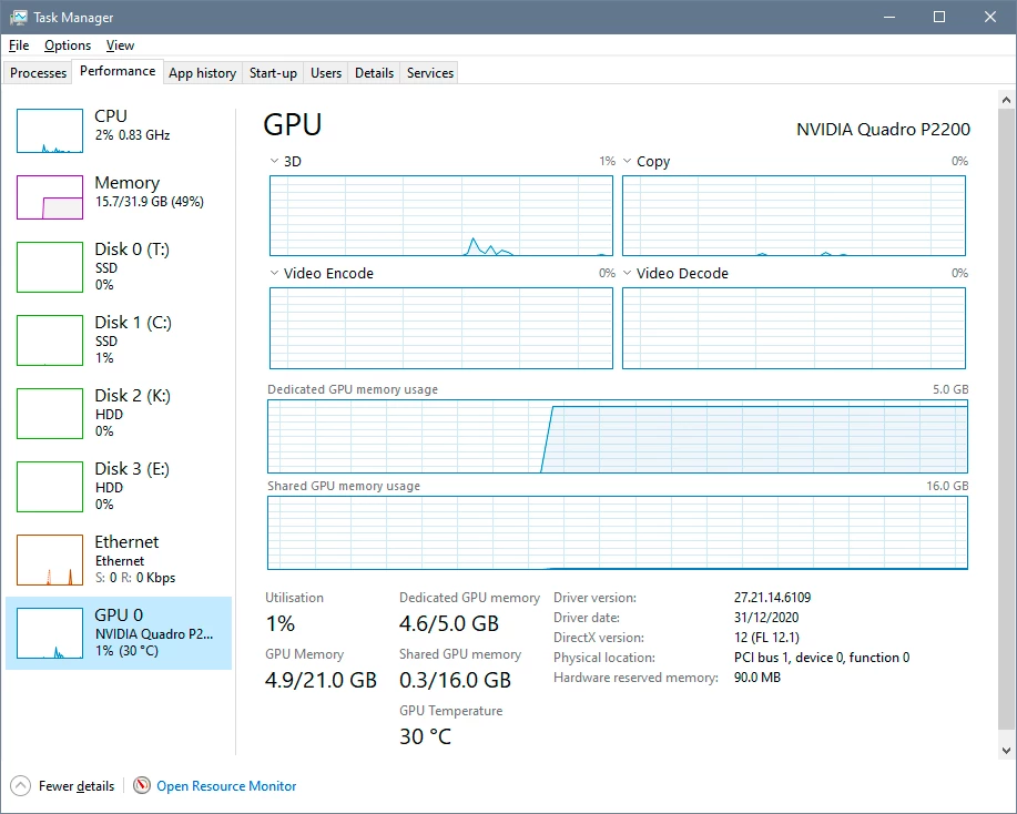 I recently replaced a 2GB Quadro P600 with a 5GB Quadro P2200. They both go to 90% and stop.