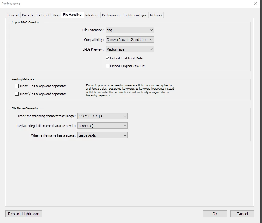 I have been running LR ever since version 3 and never experienced the documented Video Cache bug until two weeks ago.  I'm running LR ver 8.2.1 and on April 14 it loaded over 30 GB of video into the cache on my OS drive.  I looked at all the previous threads on this but I'm faced with a problem that when I open the LR Preferences and go to try to clear the cache and set it to a low number there are no settings showing on the file handling tab to do this.  I'm surprised that this well known bug continues to haunt LR users and I'm fortunate in not having a lot of videos and have a 500GB OS drive so the additional 30 or so GB of videos didn't affect things too much.
